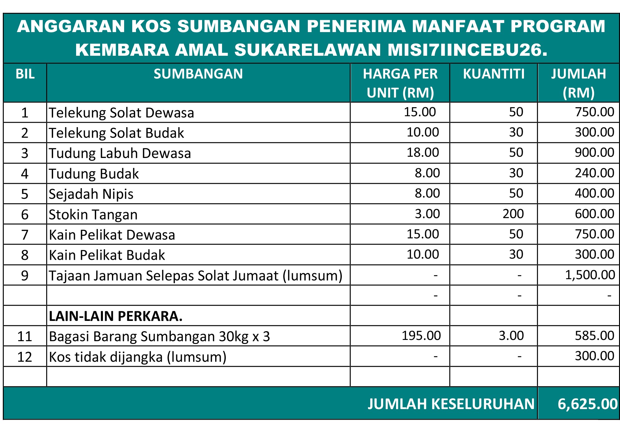 3. Tarikh tutup bagi sumbangan ini ialah pada 17 April 2026 bagi dilakukan urusan pembelian barangan yang akan dibawa.