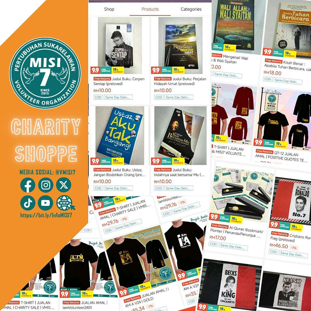 Charity Shoppe MISI7 ini adalah sebahagian usaha kami untuk menjana pendapatan sendiri buat masa ini. Sokongan berterusan dari pelbagai peringkat amatlah kami perlukan untuk terus memberikan impak yang positif dalam kerja-kerja kemanusiaan ini.