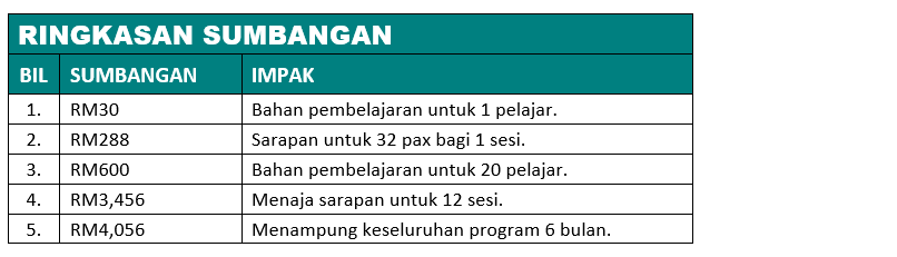 Setiap sumbangan yang diberikan akan digunakan secara terus untuk membantu pelajar yang memerlukan. Ini bukan sekadar sumbangan. Ini adalah usaha membina masa depan mereka yang kurang bernasib baik.